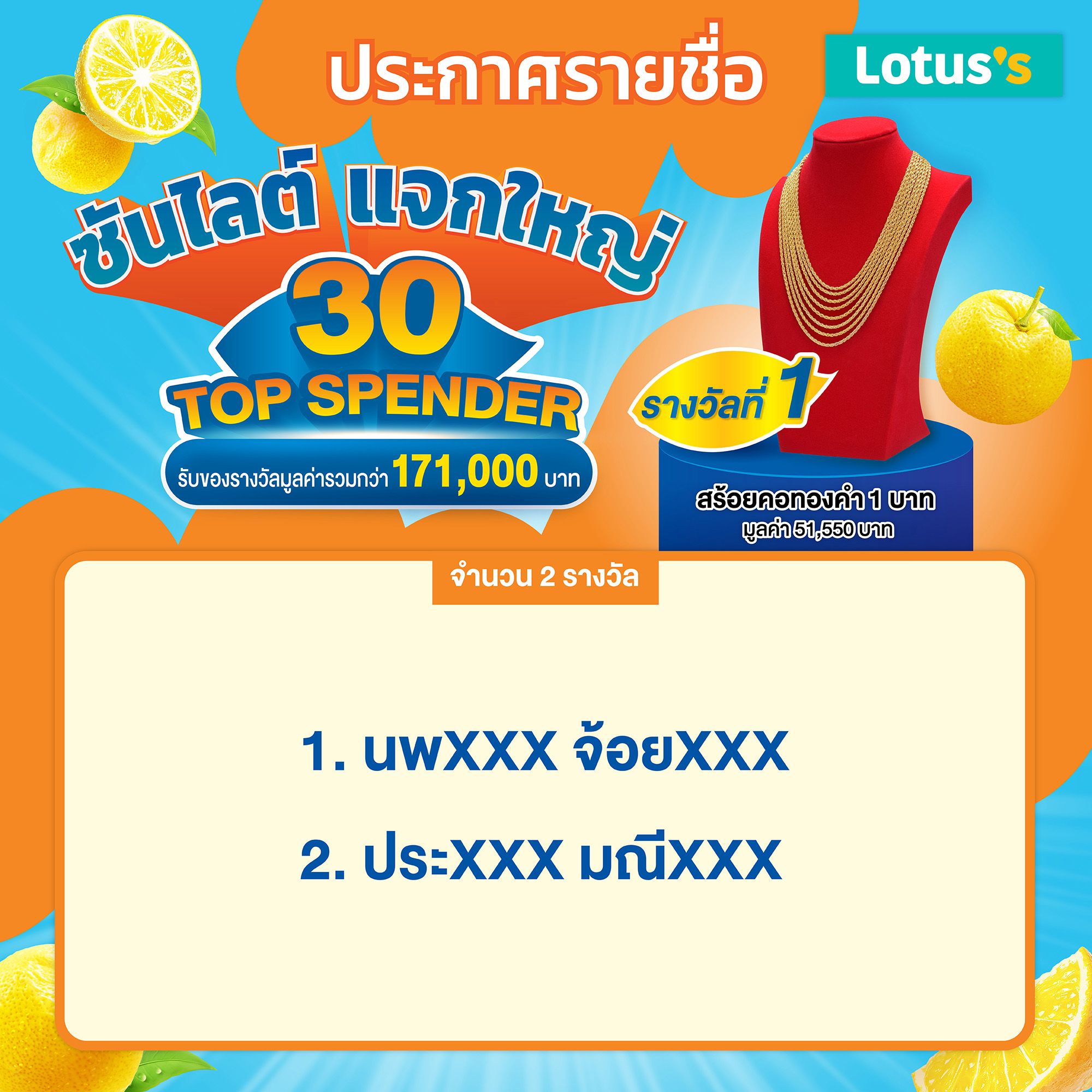 ประกาศรายชื่อผู้โชคดีผ่านทางเว็บไซต์ Lotus’s ภายในวันที่ 25 ต.ค. 2568
