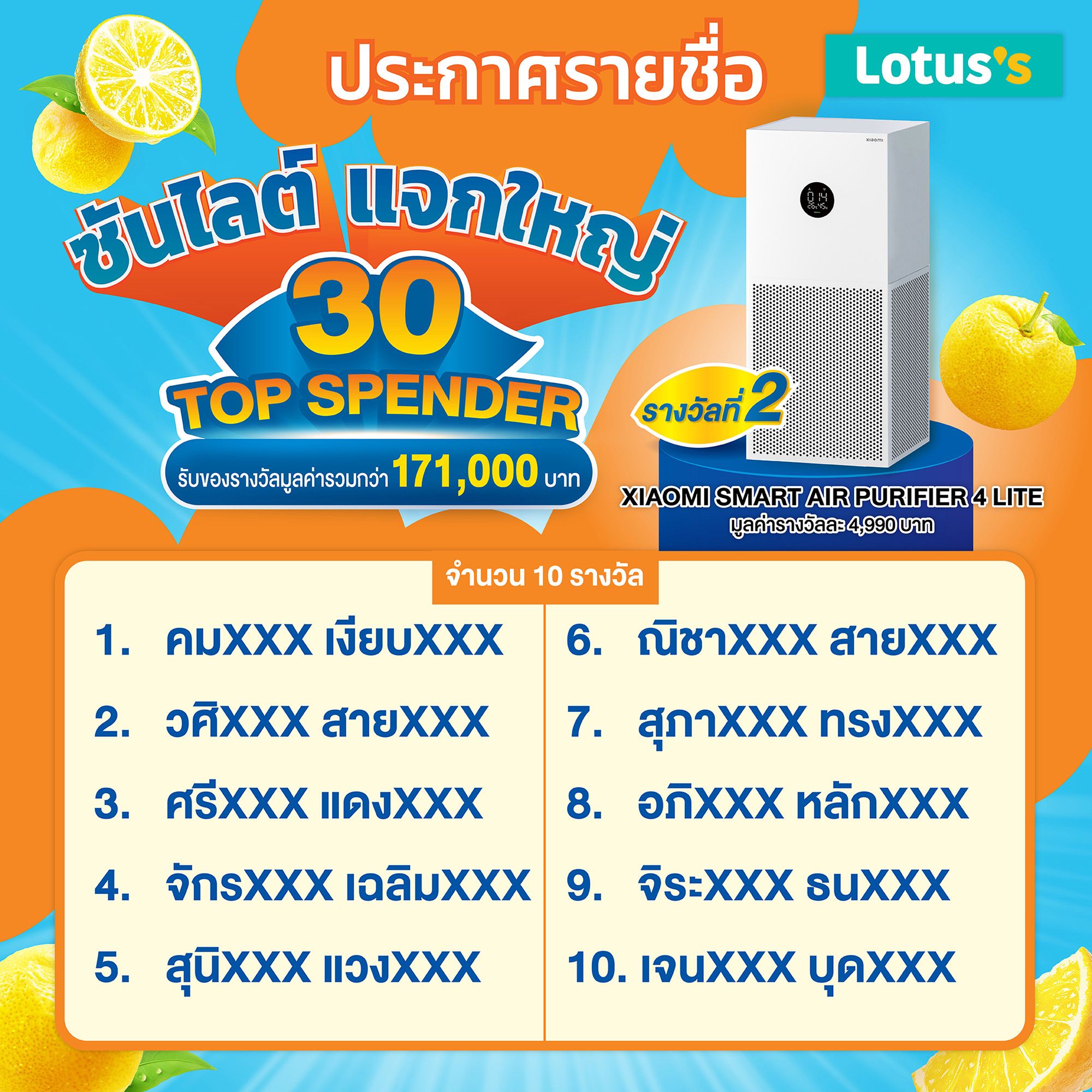 - เครื่องฟอกอากาศ XIAOMI SMART AIR PURIFIER 4 LITE มูลค่า 4,990 บาท จำนวน 10 รางวัล