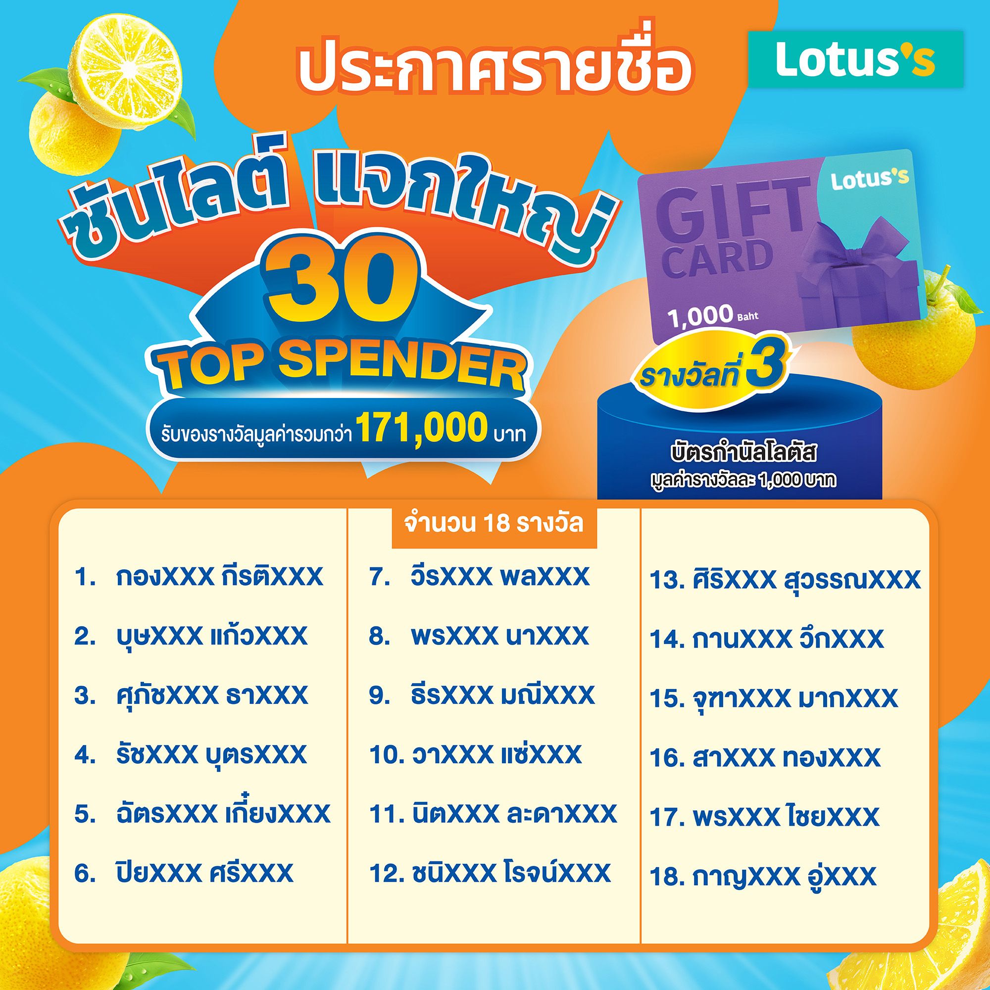 - บัตรกำนัล Lotus’s มูลค่า 1,000 บาท จำนวน 18 รางวัล