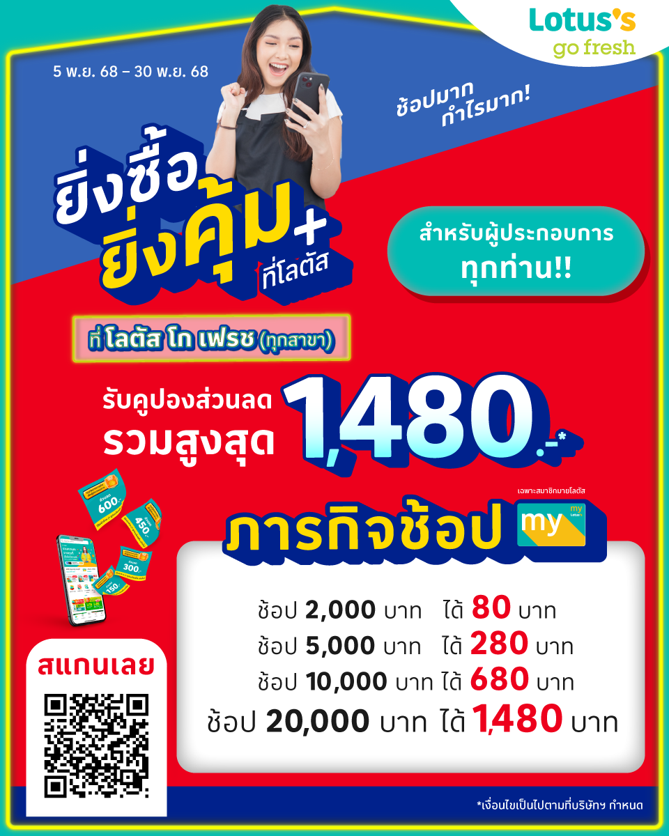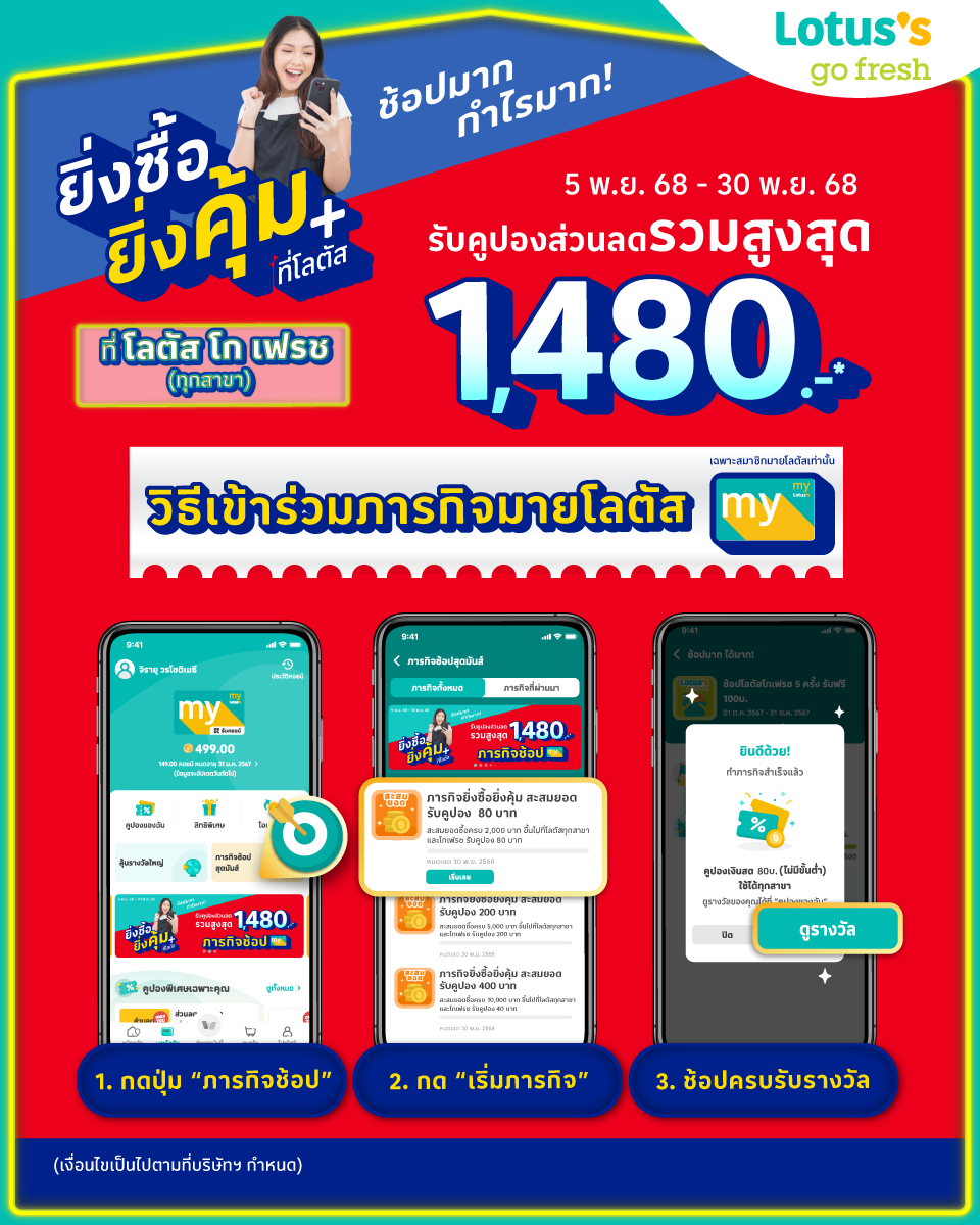 Promotions ภารกิจช้อปสะสมยอดซื้อ กับยิ่งซื้อยิ่งคุ้มที่โลตัส โก เฟรช (ทุกสาขา) 5 Nov 25 - 30 Nov 25 ภารกิจช้อปสะสมยอดซื้อ กับยิ่งซื้อยิ่งคุ้มที่โลตัส โก เฟรช (ทุกสาขา) วิธีลงทะเบียนภารกิจช้อปคลิกเพื่อลงทะเบียนภารกิจช้อป คลิกเลย Share this article