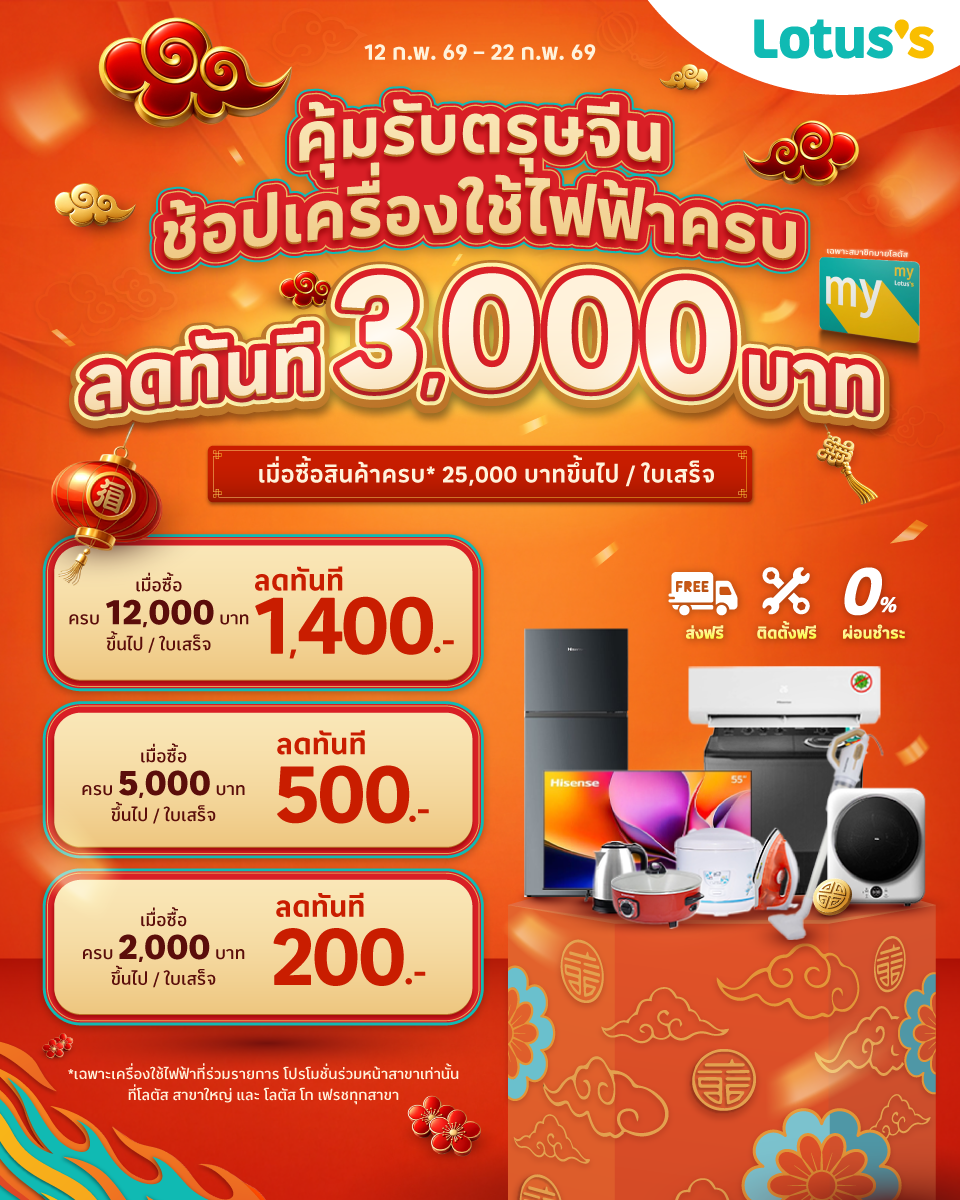 12 ก.พ. 69 – 22 ก.พ. 69 ที่โลตัส สาขาใหญ่ และ โลตัส โก เฟรช ทุกสาขา (โปรโมชั่นร่วมเฉพาะหน้าสาขาเท่านั้น)
