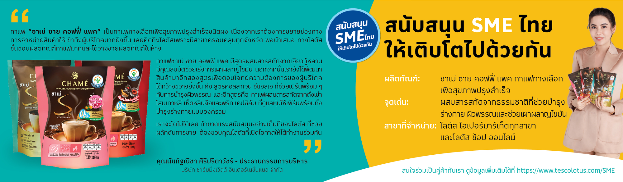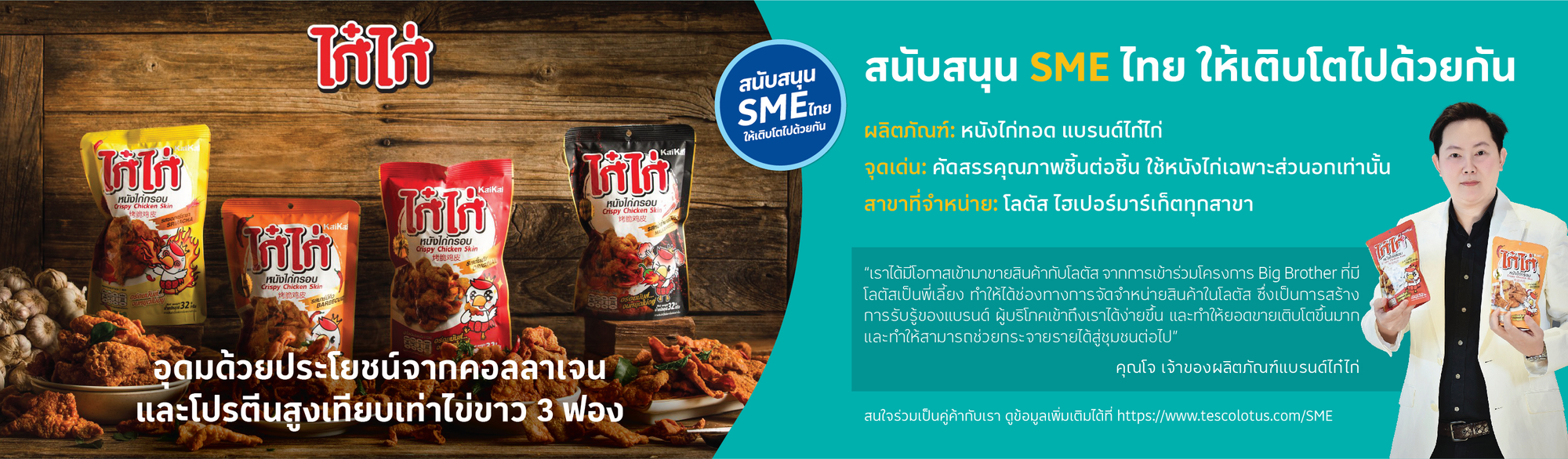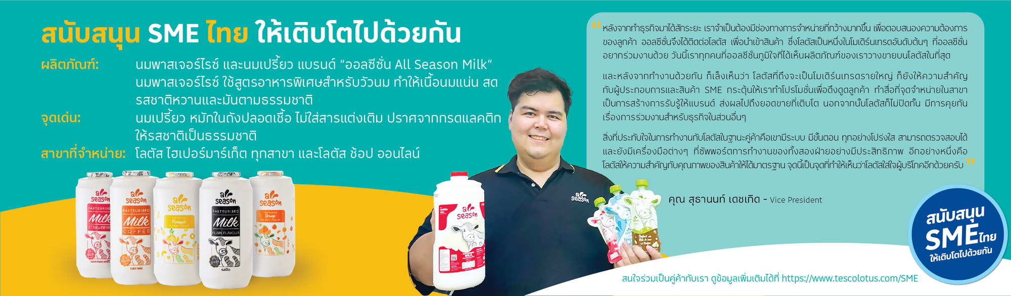สำหรับผู้ประกอบการรายย่อยที่เป็นคู่ค้าของเรา โลตัส มิได้เป็นเพียงช่องทางจำหน่ายสินค้าเท่านั้น แต่เราให้ความสำคัญในการช่วยพัฒนาศักยภาพของ SME ผ่านการยกระดับมาตรฐานความปลอดภัยของสินค้า มาตรฐานการผลิต มาตรฐานคุณภาพ นโยบายด้านการจัดหาสินค้าด้วยความรับผิดชอบ สวัสดิภาพแรงงาน และสวัสดิภาพสัตว์ ซึ่งมาตรฐานและความเป็นเลิศเหล่านี้ ช่วยให้ผู้ประกอบการ SME ไทยสามารถเพิ่มโอกาสในการส่งออกสินค้าไปยังตลาดต่างประเทศ เนื่องจากมีมาตรฐานในระดับสากล