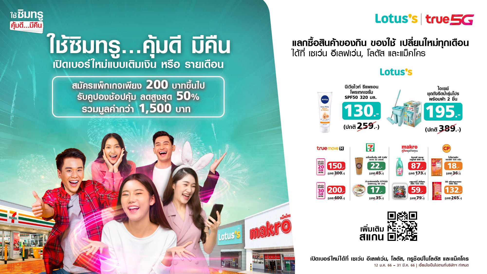 “ใช้ซิมทรู…คุ้มดี มีคืน” สมัครแพ็กเกจเพียง 200 บาทขึ้นไป รับคืนคูปองส่วนลดกว่า 1,500 บาท ซื้อแพ็กเน็ตเสริม เต็มสปีด ทรู 5G และสินค้าอีกเพียบ! ยกขบวนมาทั้งของกิน อิ่ม อร่อย และของใช้หลากหลายรายการ ลดสูงสุดถึง 50% ได้ที่ โลตัส (สินค้าเปลี่ยนใหม่ทุกเดือน) ที่สุดของความคุ้ม ให้คุณสุขกว่าทุกวัน