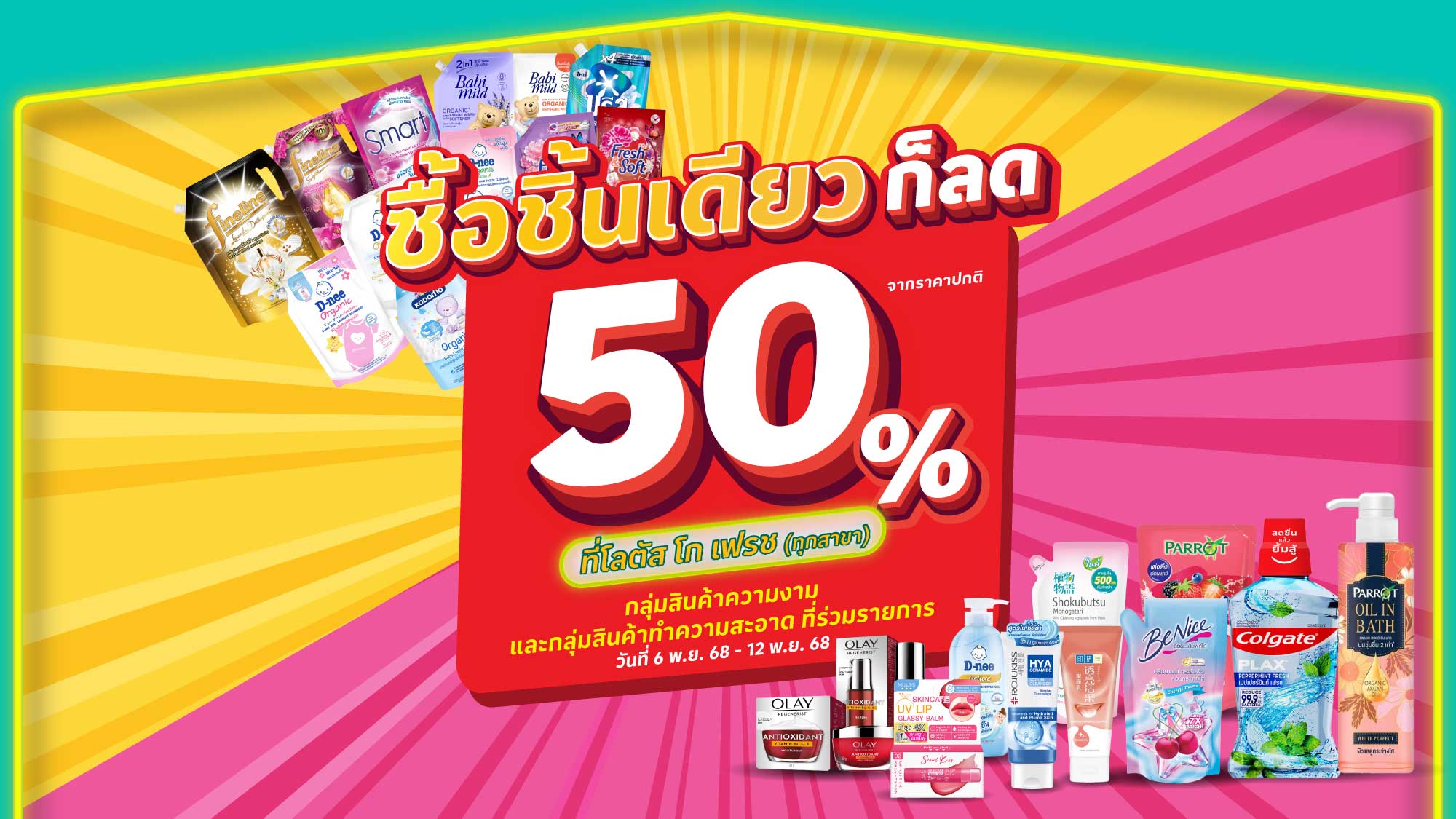 ลดแรง 50% กลุ่มสินค้าความงาม และกลุ่มสินค้าทำความสะอาดที่ร่วมรายการ