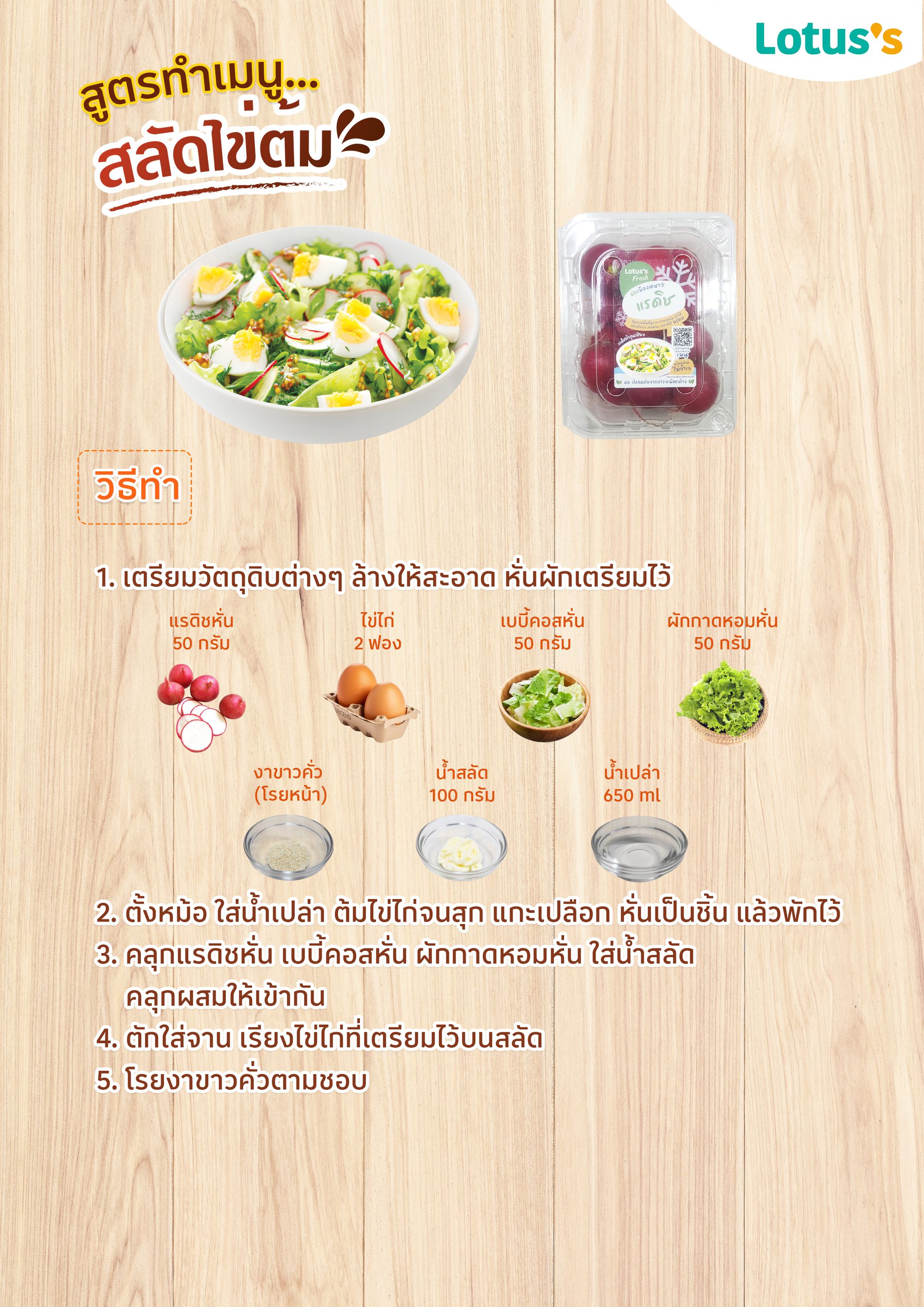 - ตักใส่จาน เรียงไข่ไก่ที่เตรียมไว้บนสลัด