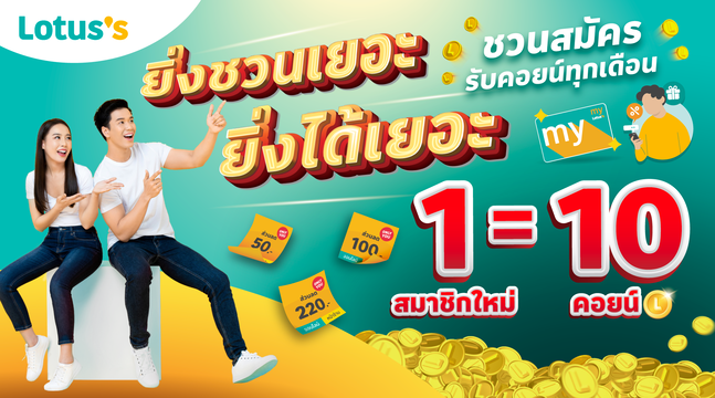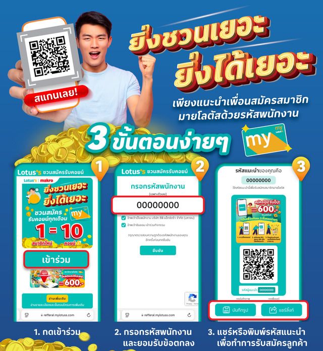 สิทธิพิเศษสำหรับพนักงานโลตัสทุกคนรับคอยน์จุกๆ เพียงชวนลูกค้า เพื่อน และครอบครัว สมัครสมาชิกมายโลตัสด้วยรหัสแนะนำของตนเอง (เลขรหัสพนักงาน) รับเลย! 10 คอยน์ทุกการแนะนำต่อสมาชิกใหม่ 1 ท่าน