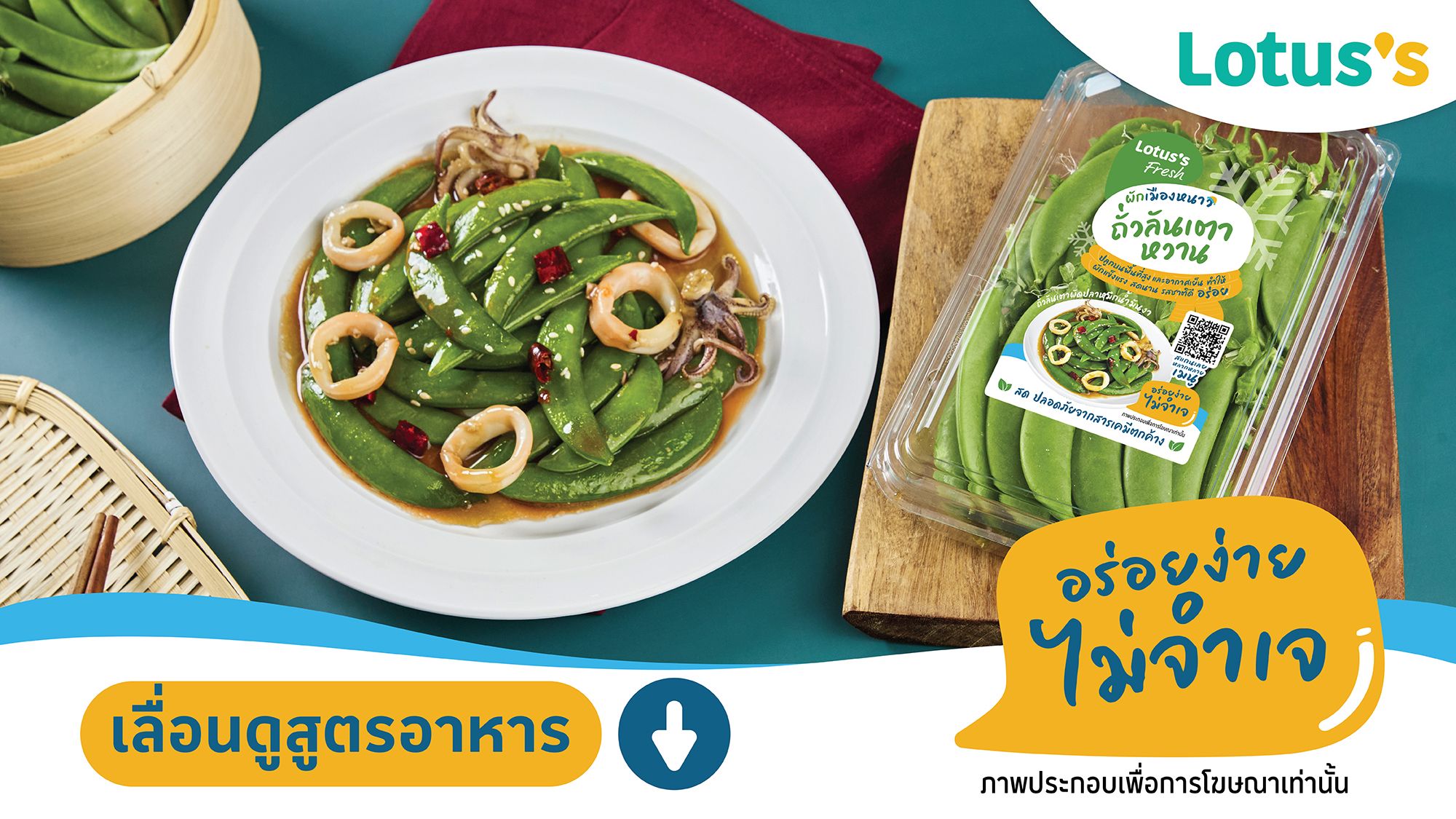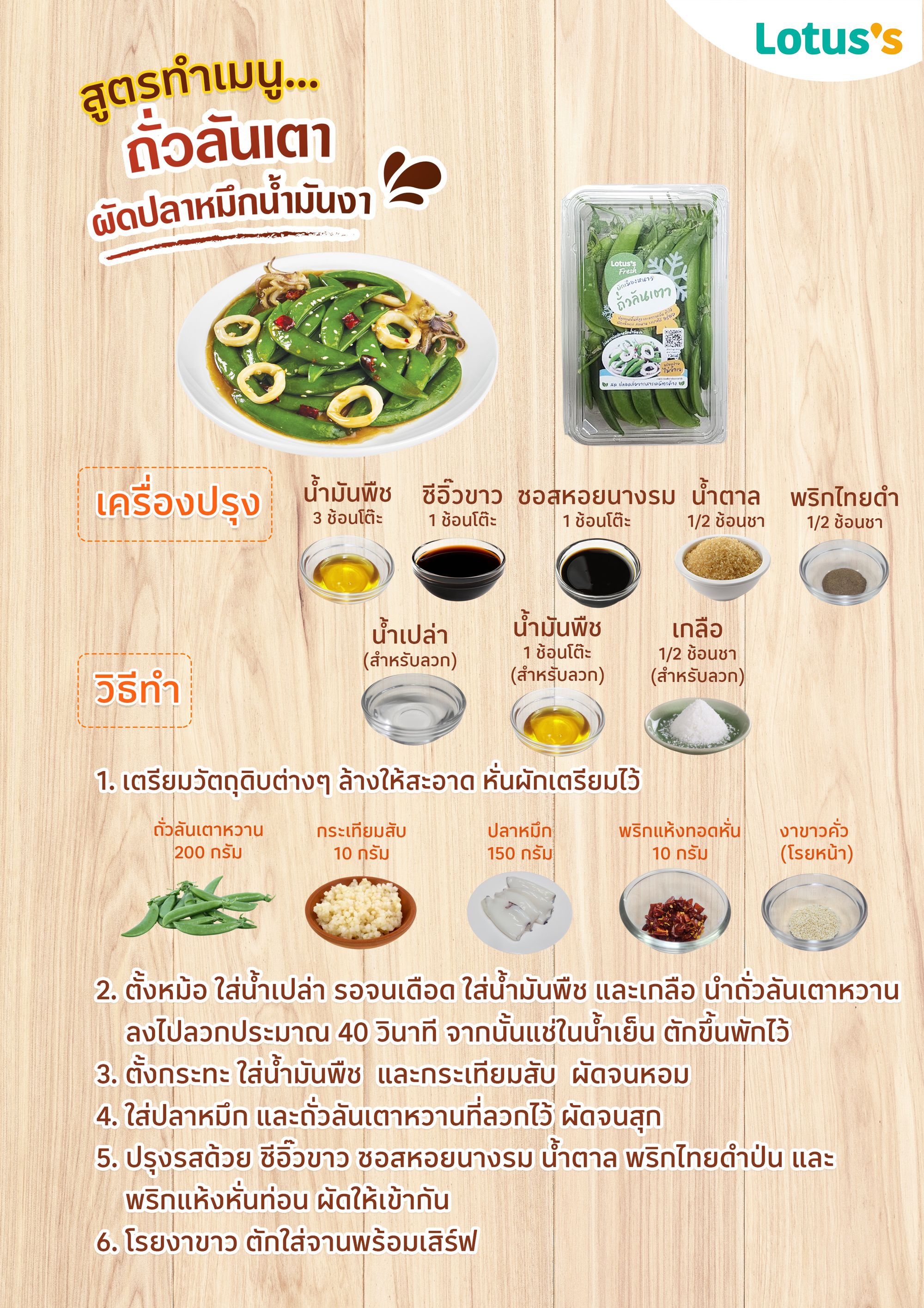ถั่วลันเตาผัดปลาหมึกน้ำมันงา