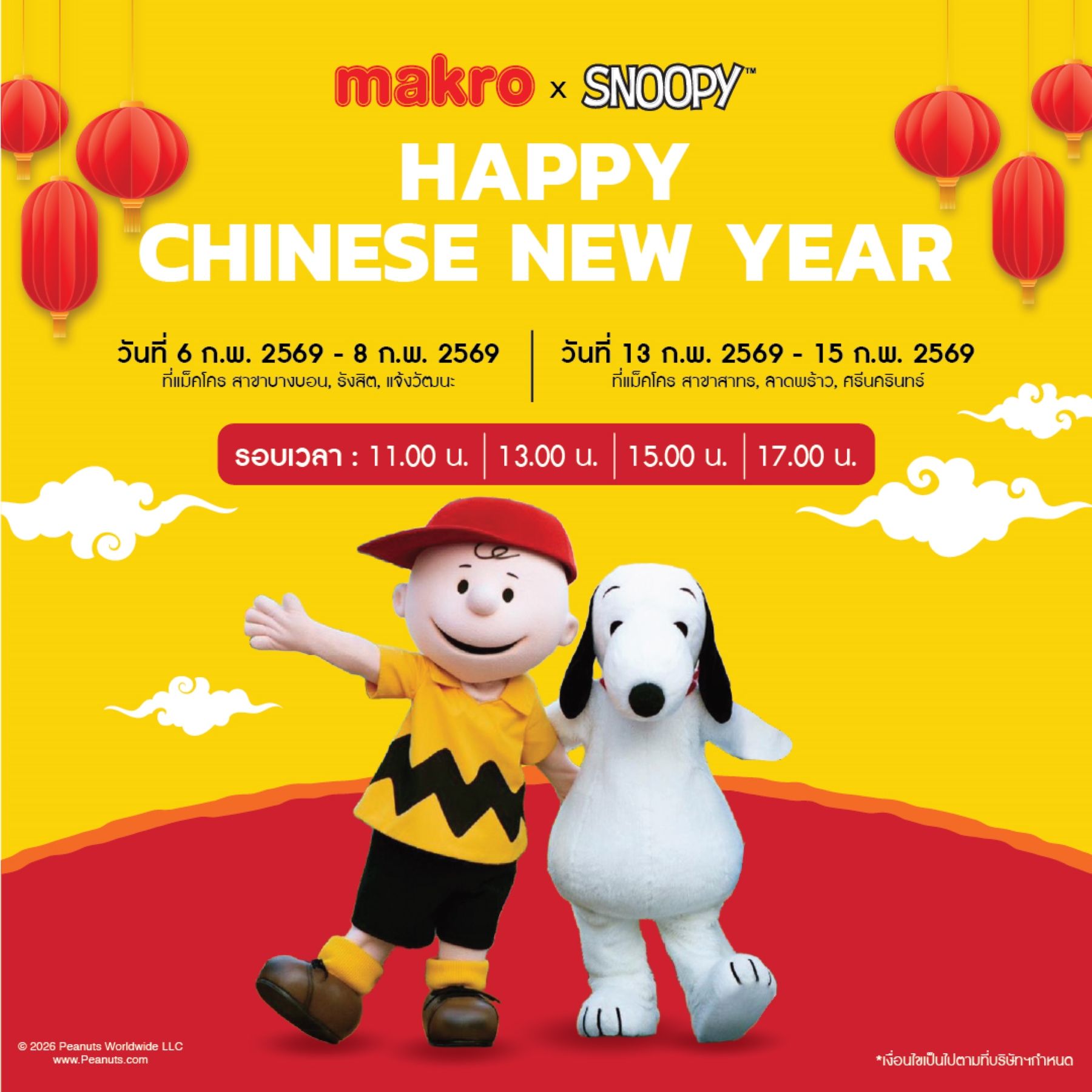 - แม็คโคร จัดกิจกรรมต้อนรับตรุษจีนในบรรยากาศสนุกสนาน กับกิจกรรมธีม Snoopy ที่มาสร้างรอยยิ้มและความสุขให้กับผู้มาใช้บริการ วันที่ 6-8 ก.พ. 2569 ที่แม็คโคร สาขาบางบอน, รังสิต และแจ้งวัฒนะ วันที่ 13-15 ก.พ. 2569 ที่แม็คโคร สาขาสาทร, ลาดพร้าว และศรีนครินทร์ (รอบเวลา 11.00 น. / 13.00 น. / 15.00 น. / 17.00 น.)