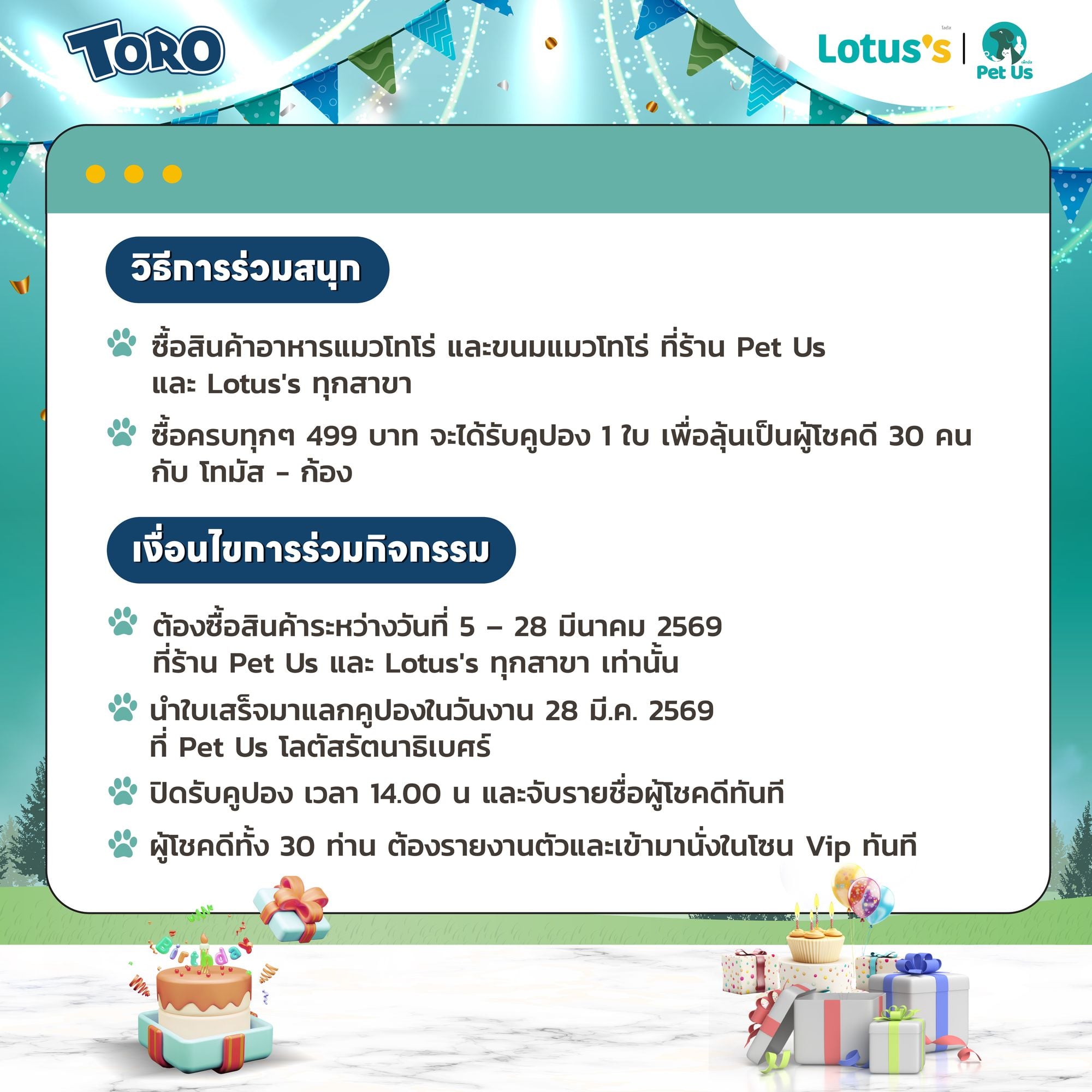 เพียงซื้อสินค้าอาหารแมวและขนมแมวโทโร่ ครบทุกๆ 499 บาท รับคูปอง 1 ใบ เพื่อลุ้นเป็นผู้โชคดี 30 คน