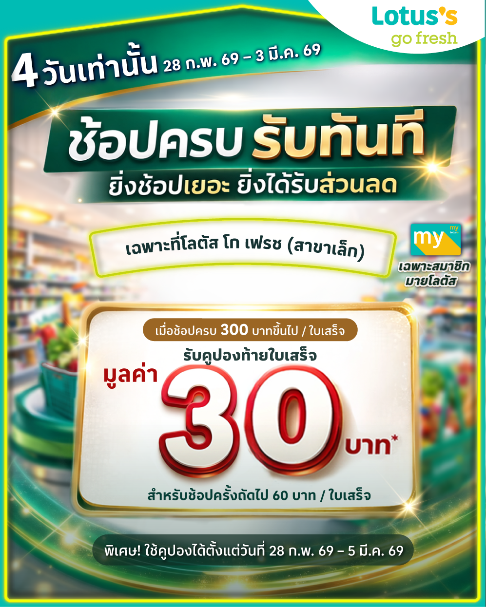 - เมื่อซื้อสินค้าที่โลตัส โก เฟรช (สาขาเล็ก) ครบ 300 บาทขึ้นไปต่อใบเสร็จ ตั้งแต่วันที่ 28 ก.พ. 69 – 3 มี.ค. 69 รับคูปองส่วนลดท้ายใบเสร็จมูลค่า 30 เพื่อเป็นส่วนลดสำหรับใช้ครั้งถัดไปเมื่อชื้อสินค้าครบ 60 บาทขึ้นไป จำกัดการแจก 1 คูปอง ต่อ 1 ใบเสร็จ ต่อ สมาชิก ต่อ 24 ชั่วโมง