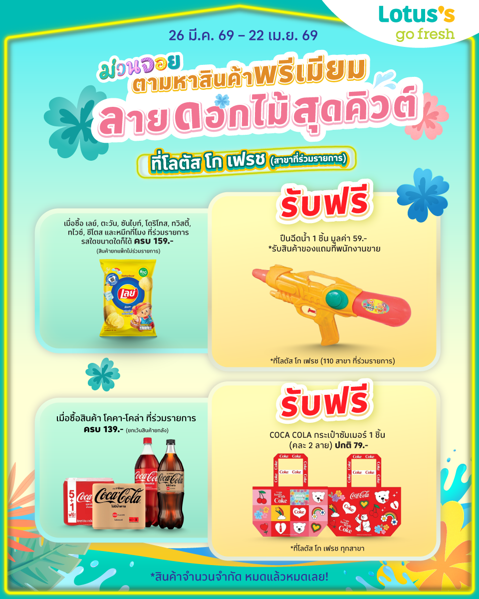*เฉพาะหน้าร้านเท่านั้น ช้อปครบ รับฟรี! สินค้าพรีเมียม 26 มี.ค. 69 – 22 เม.ย. 69 ที่โลตัส โก เฟรช (ที่ร่วมรายการ)