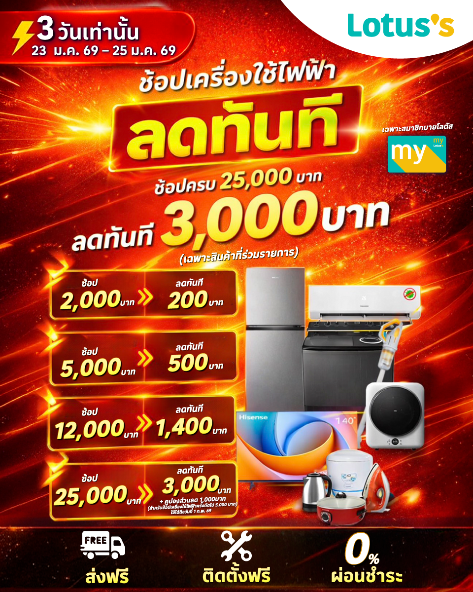 3 วันเท่านั้น! ช้อปเครื่องใช้ไฟฟ้าที่โลตัส ลดใหญ่จัดเต็ม ลดสูงสุด 3,000.- คุ้มกว่านี้ไม่มีอีกแล้ว! สำหรับสมาชิกมายโลตัส