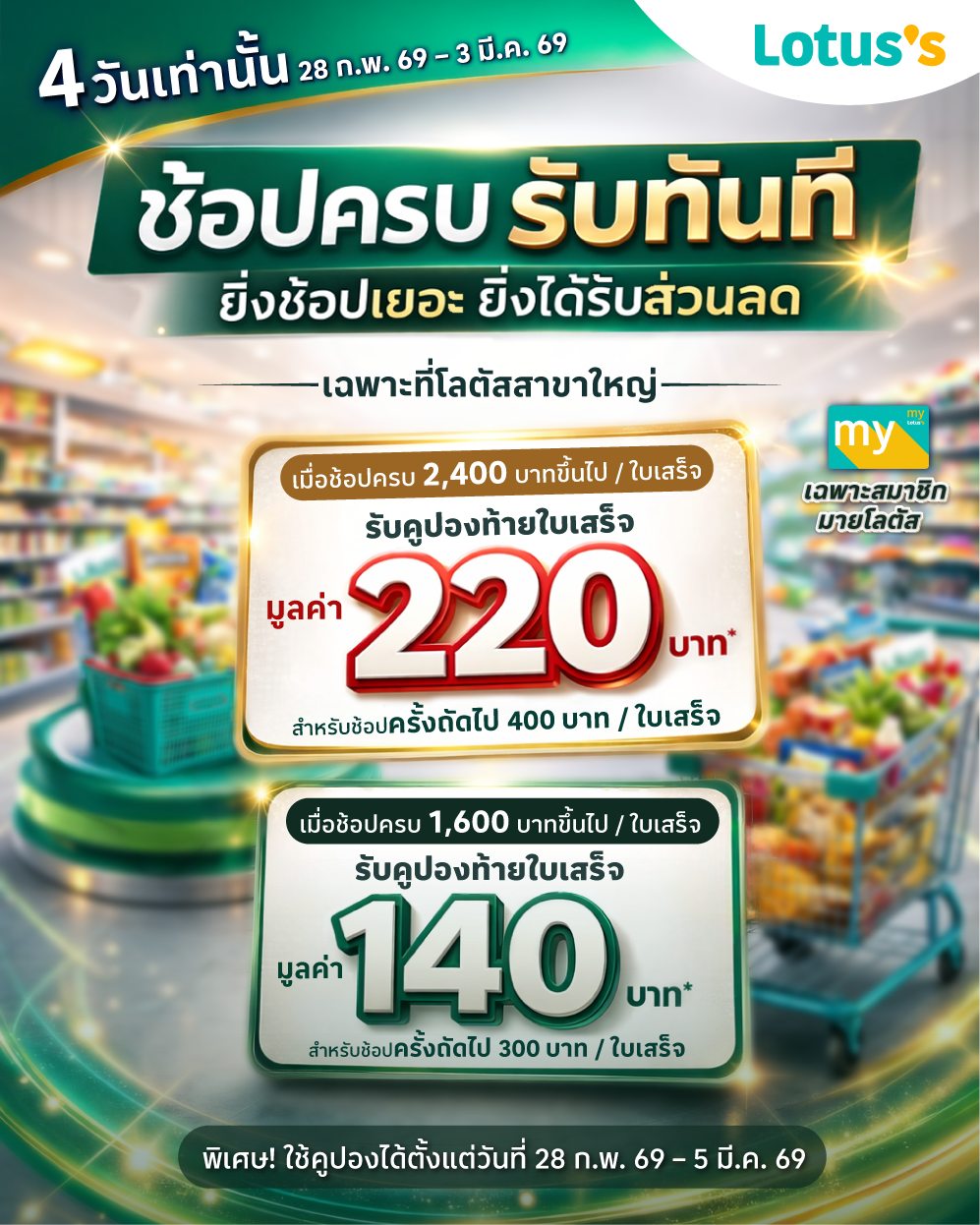 - เมื่อซื้อสินค้าที่โลตัสไฮเปอร์มาร์เก็ต ครบ 1,600 – 2,399 บาทต่อใบเสร็จ ตั้งแต่วันที่ 28 ก.พ. 69 – 3 มี.ค. 69 รับคูปองส่วนลดท้ายใบเสร็จมูลค่า 140 เพื่อเป็นส่วนลดสำหรับใช้ครั้งถัดไปเมื่อชื้อสินค้าครบ 300 บาทขึ้นไป จำกัดการแจก 1 คูปอง ต่อ 1 ใบเสร็จ ต่อ สมาชิก ต่อ 24 ชั่วโมง