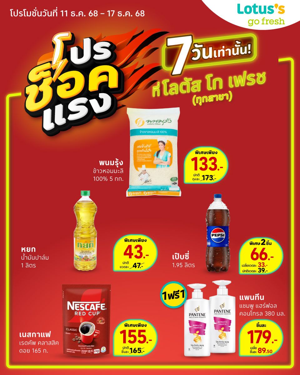 โปรโมชั่น โปรช็อคแรงที่โลตัส โก เฟรช 11 ธ.ค. 68 – 17 ธ.ค. 68 โปรช็อคแรงที่โลตัส โก เฟรช จัดเต็ม 7 วันเท่านั้น สินค้าของกินและของใช้ราคาพิเศษช้อปเลย แชร์บทความนี้