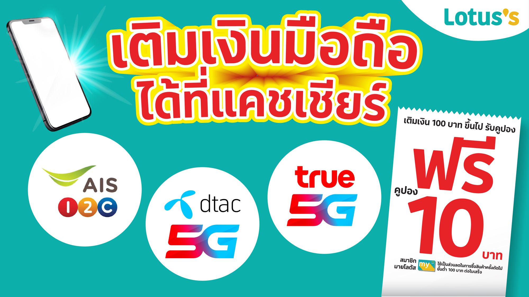✅สมาชิกมายโลตัส เมื่อเติมเงินมือถือทุกเครือข่าย ที่โลตัส และซีพี เฟรชมาร์ท (เฉพาะสาขาที่ร่วมรายการ) 100 บาทขึ้นไป รับทันทีคูปองท้ายบิล 10 บาท สำหรับซื้อสินค้าครั้งถัดไปขั้นต่ำ 100 บาท /ใบเสร็จ จำกัดคูปอง 3 ใบ /สมาชิกมายโลตัส /วัน คูปอง 1 ใบ ใช้ได้ที่โลตัสทุกสาขา (ยกเว้นช้อปออนไลน์) รับเติมเงินด้วยเงินสดเท่านั้น